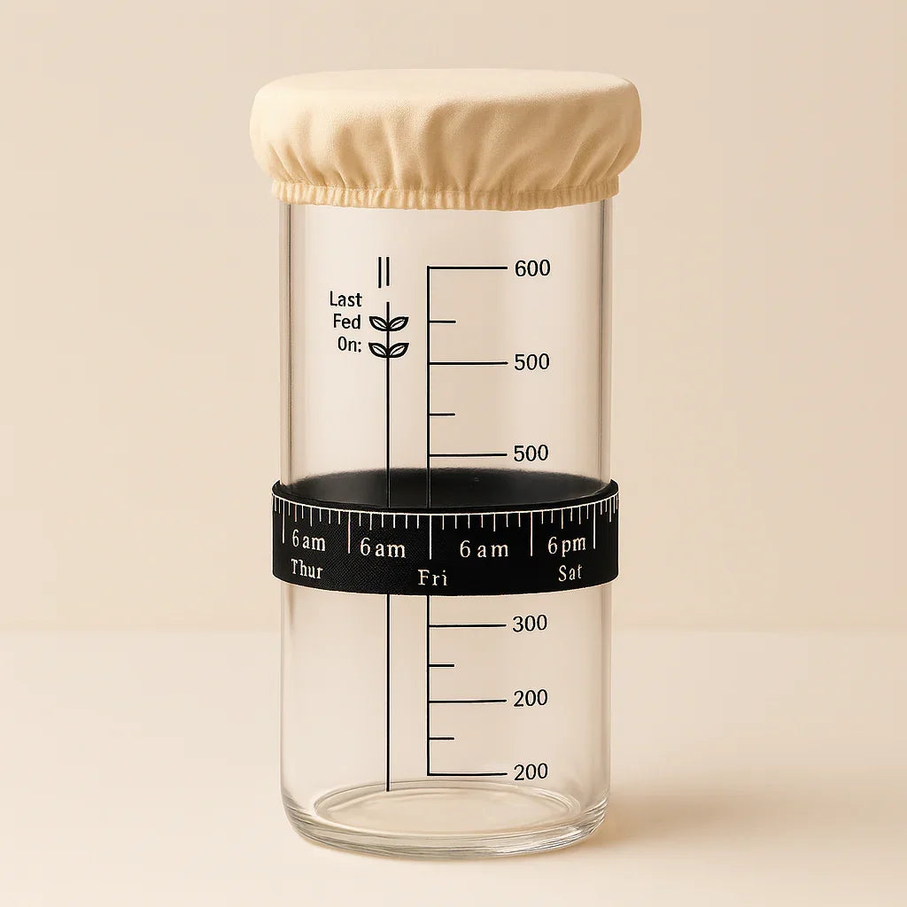 Premium glass jar with clear rise markers and a breathable cloth lid - built to help you track growth easily and keep your starter thriving. Includes a day/time tracking band so you never miss a feeding.